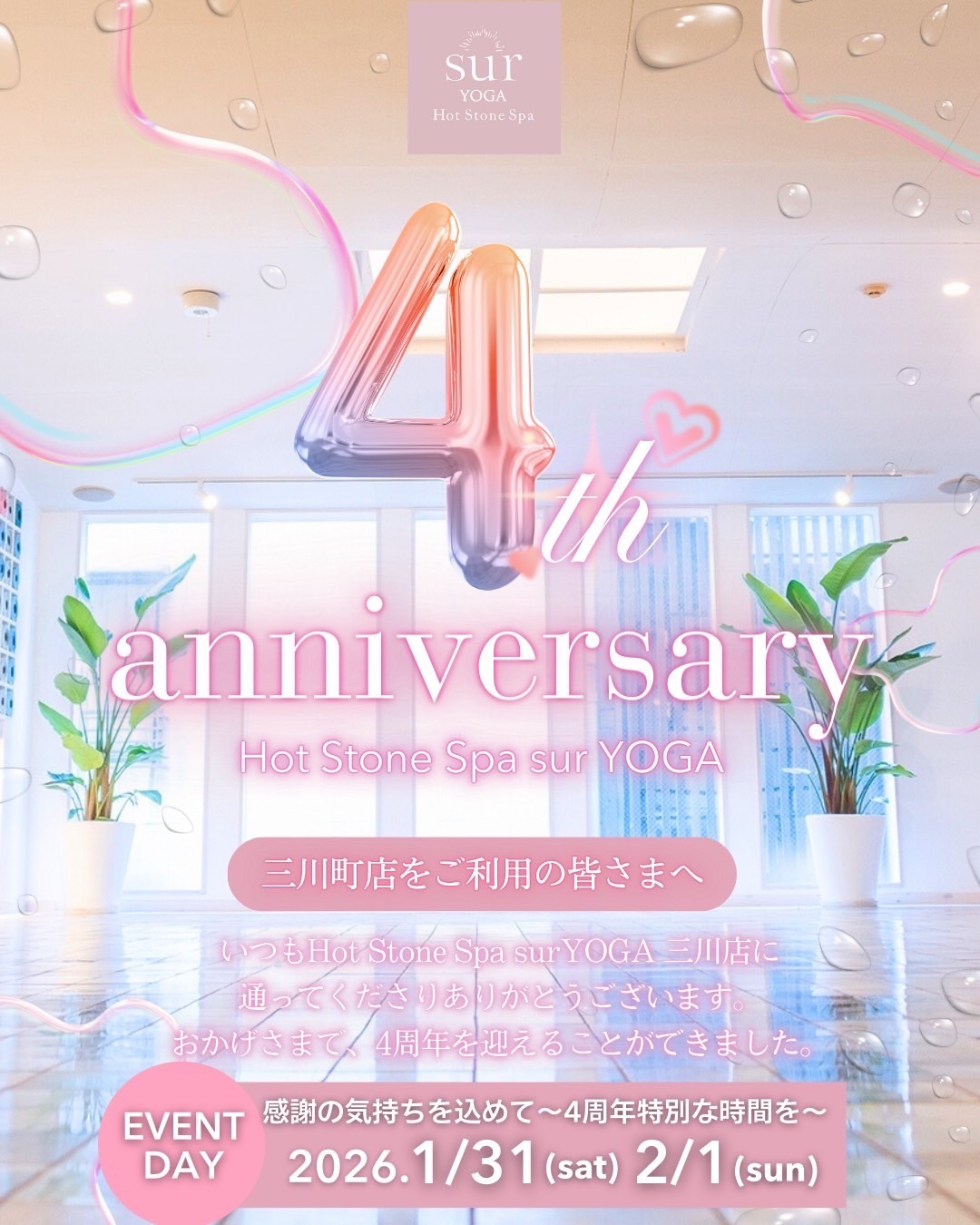 【Hot Stone Spa surYOGA三川町店】4周年の感謝を込めて|記念イベントのご案内